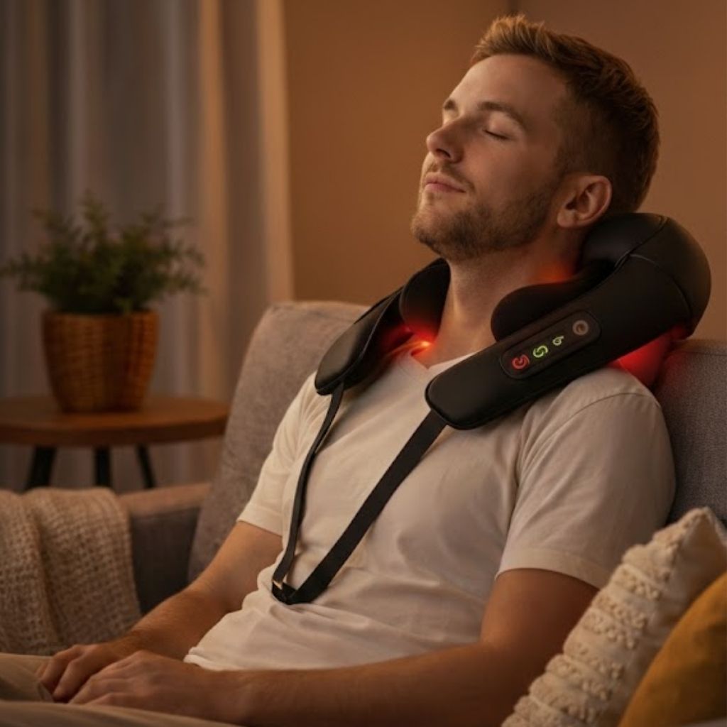 Rotating kneading nodes provide a steady massage sensation, and optional gentle warmth can be enabled during use. The cordless construction allows convenient use on a sofa or chair without cables.